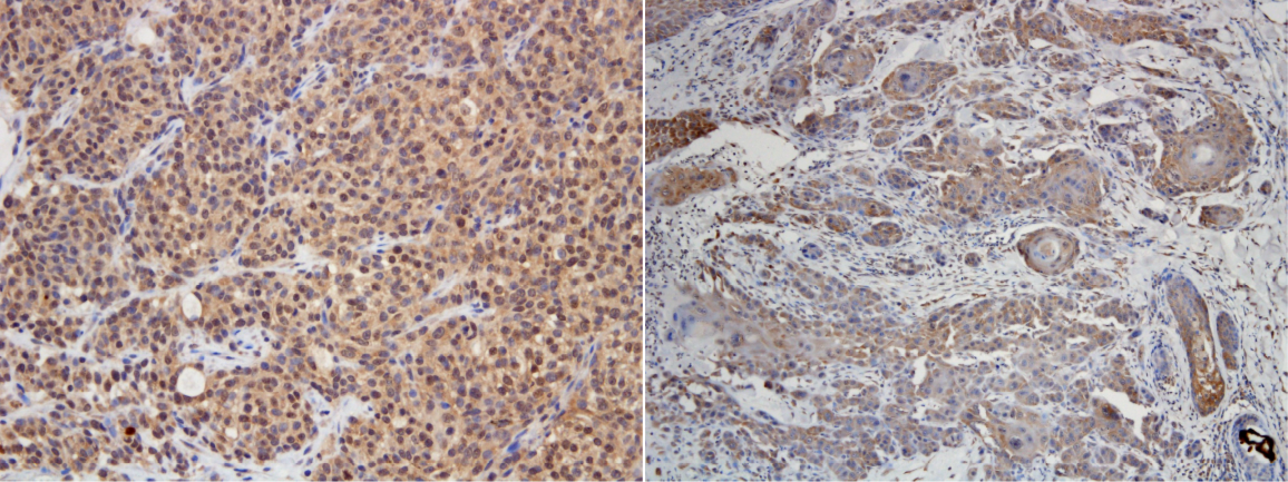 PD-L1 immunohistochemical staining in typical oral malignant melanoma (left) and squamous cell skin cancer (right).
