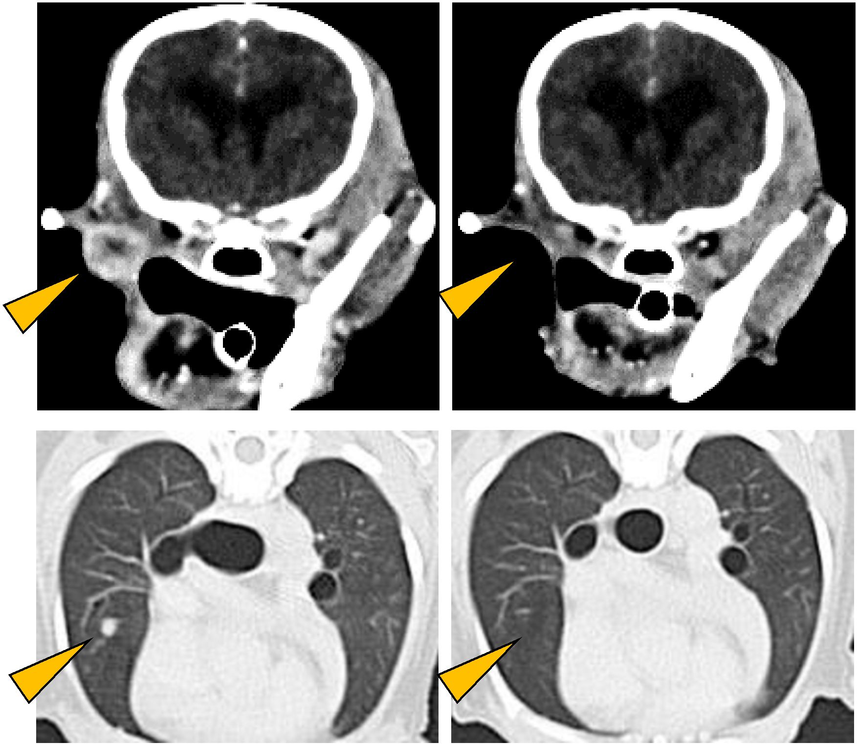 CT images of oral malignant melanoma (upper left) and its lung metastases (lower left) observed in a Pomeranian (12 years old, male).