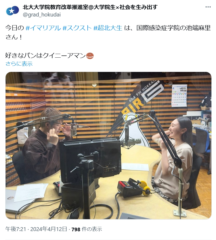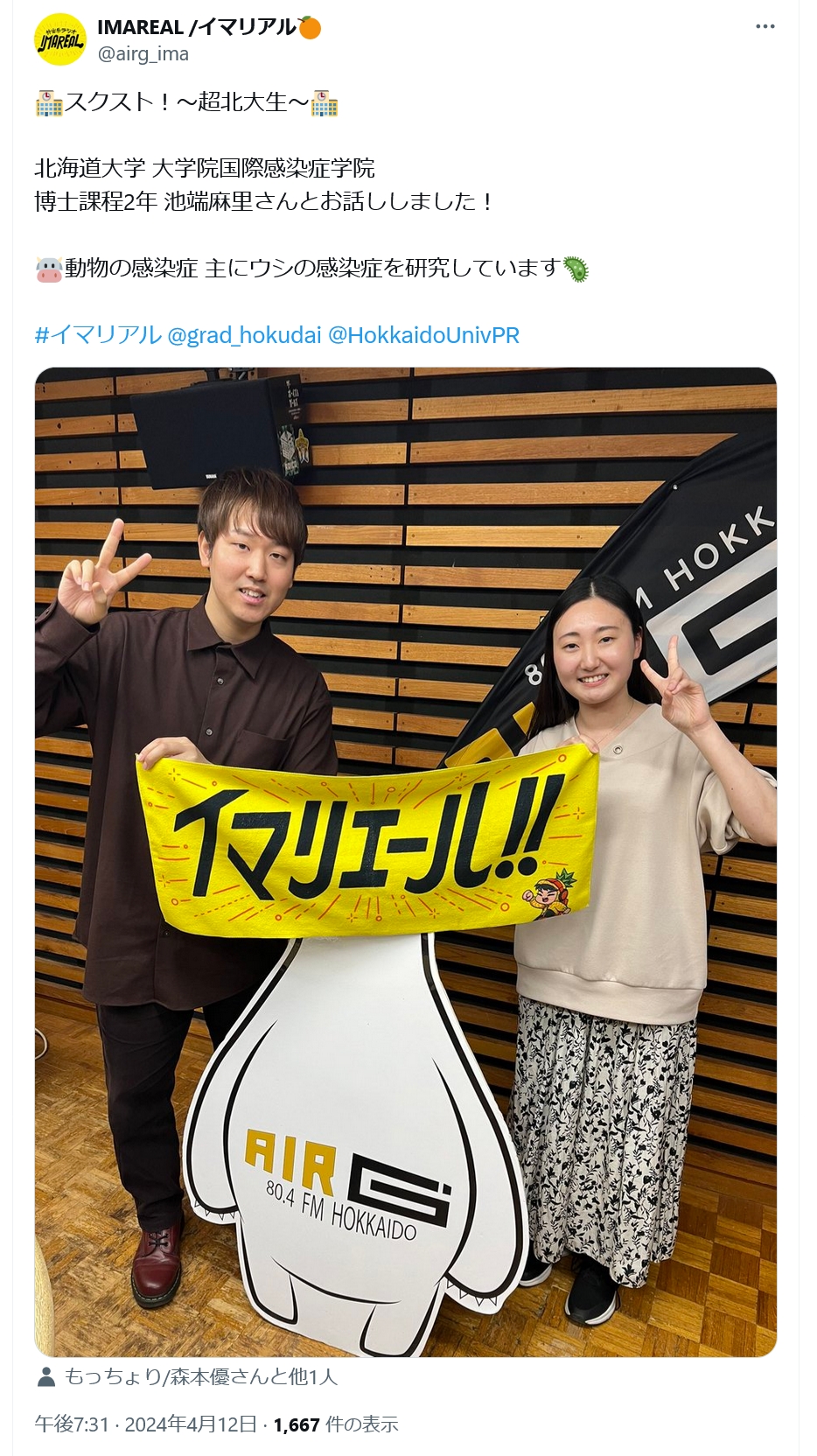 当教室の池端 麻里 さん(博士課程2年)が、4/12(金)に放送されたFM北海道 (AIR-G')「IMAREAL」のコーナー「スクスト!〜超北大生〜」に生出演しました。